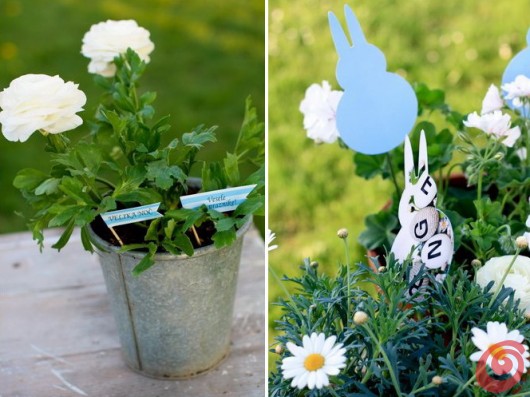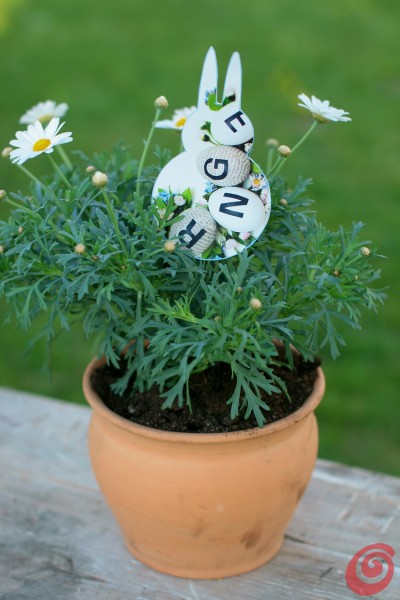 Zajce smo natisnili na malce trši karton, izrezali smo jih, jih prilepili na palčke ter jih zasadili med belo cvetoče pomladne lončnice, kot so ranunkule in vrtne marjetke. Letos želimo, da nam na mizi poleg hrane dela družbo tudi cvetje.