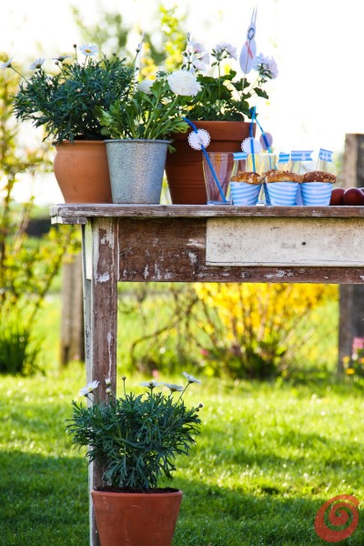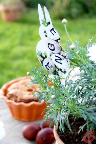 Gotovo imate na balkonu, terasi ali vrtu kot za posedanje. Mi smo potegnili na plan našo staro mizo, ki ji je vreme že ukrojilo podobo. Postavili smo jo na prosto in jo okrasili s cvetjem, zajci in pecivom, tudi na potico in pirhe nismo pozabili.