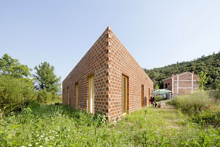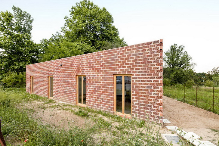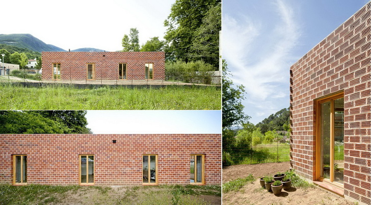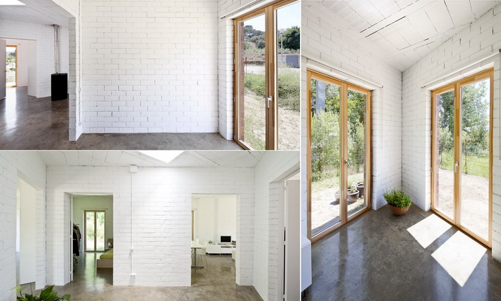 Hiša je zgrajena iz opeke, ki je na notranji strani pobarvana v belo, na zunanji pa ostaja naravne barve.